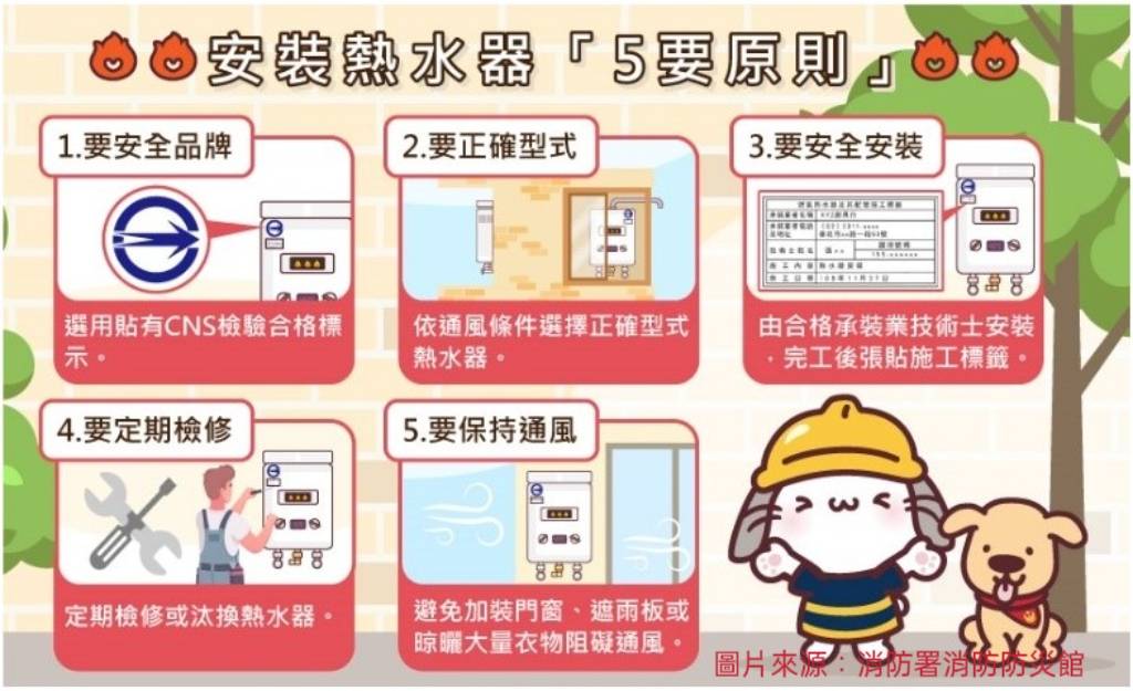 安裝熱水器,做對五件事(五要),遠離隱形殺手「一氧化碳」: