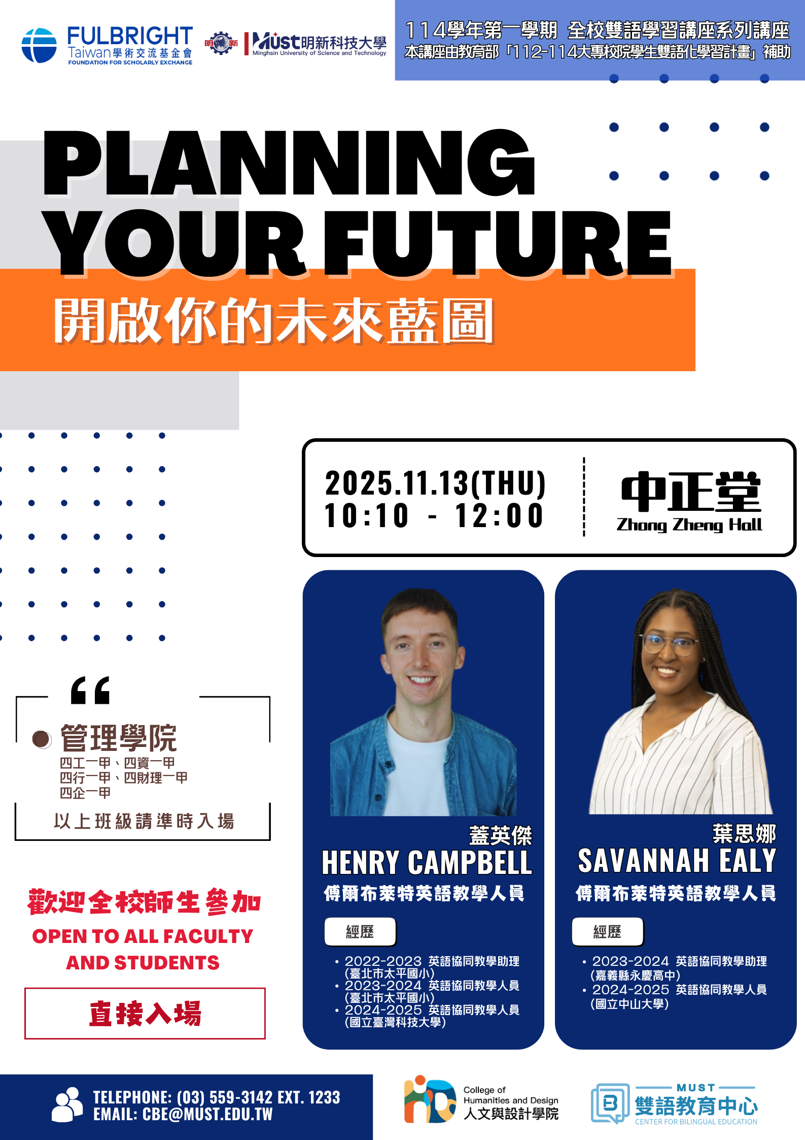 【✨人文與設計學院 雙語教育中心/公告】邀請 Fulbright Taiwan 蒞校舉辦雙語學習系列講座〈Planning Your Future〉歡迎全校師生參加!