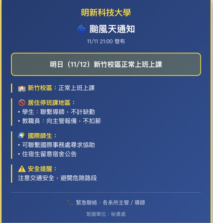 【人力資源處公告】因應鳳凰颱風來襲,緊急通知-明日(11/12)正常上班上課