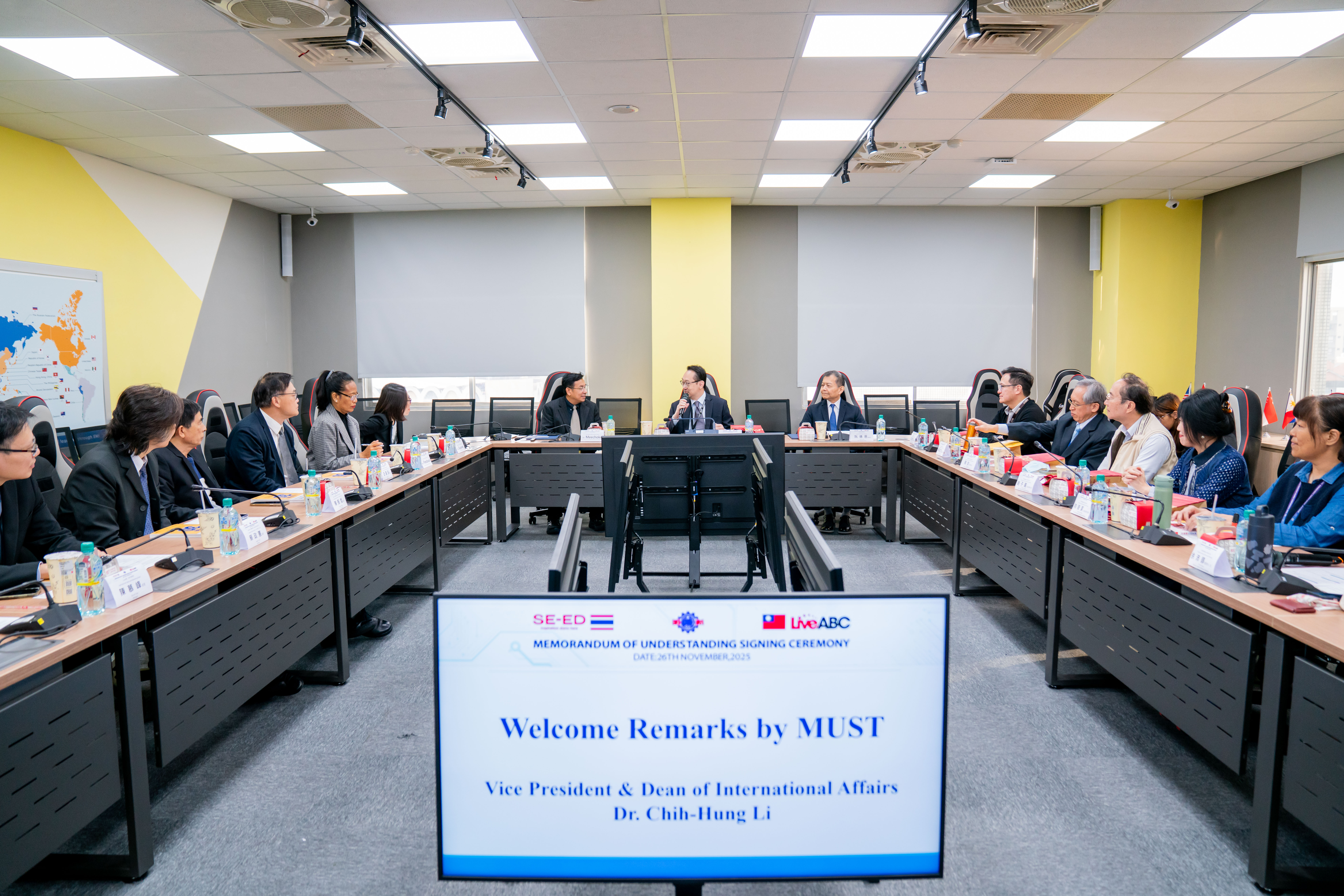 SE-ED 是泰國最大教育出版與書店集團,擁有 200 家門市,長期致力於推廣知識與終身學習。泰國 SE-ED 教育集團副總裁 Dr. Meechoke 表示:「SE-ED 不僅是一家商業公司,更重視教育、永續與知識價值的推動。我們十分珍惜與明新科大及 LiveABC 攜手合作的機會。這份 MOU 不只是文件,而是三方共同願景、相互尊重與推動教育創新的象徵。」他也肯定明新科大在半導體培育、國際學生支持與跨域教學上的能量,並表示對明新校園中近千名國際學生印象深刻,期待合作開啟更多聯合研究、人才培育與跨國教育交流。
