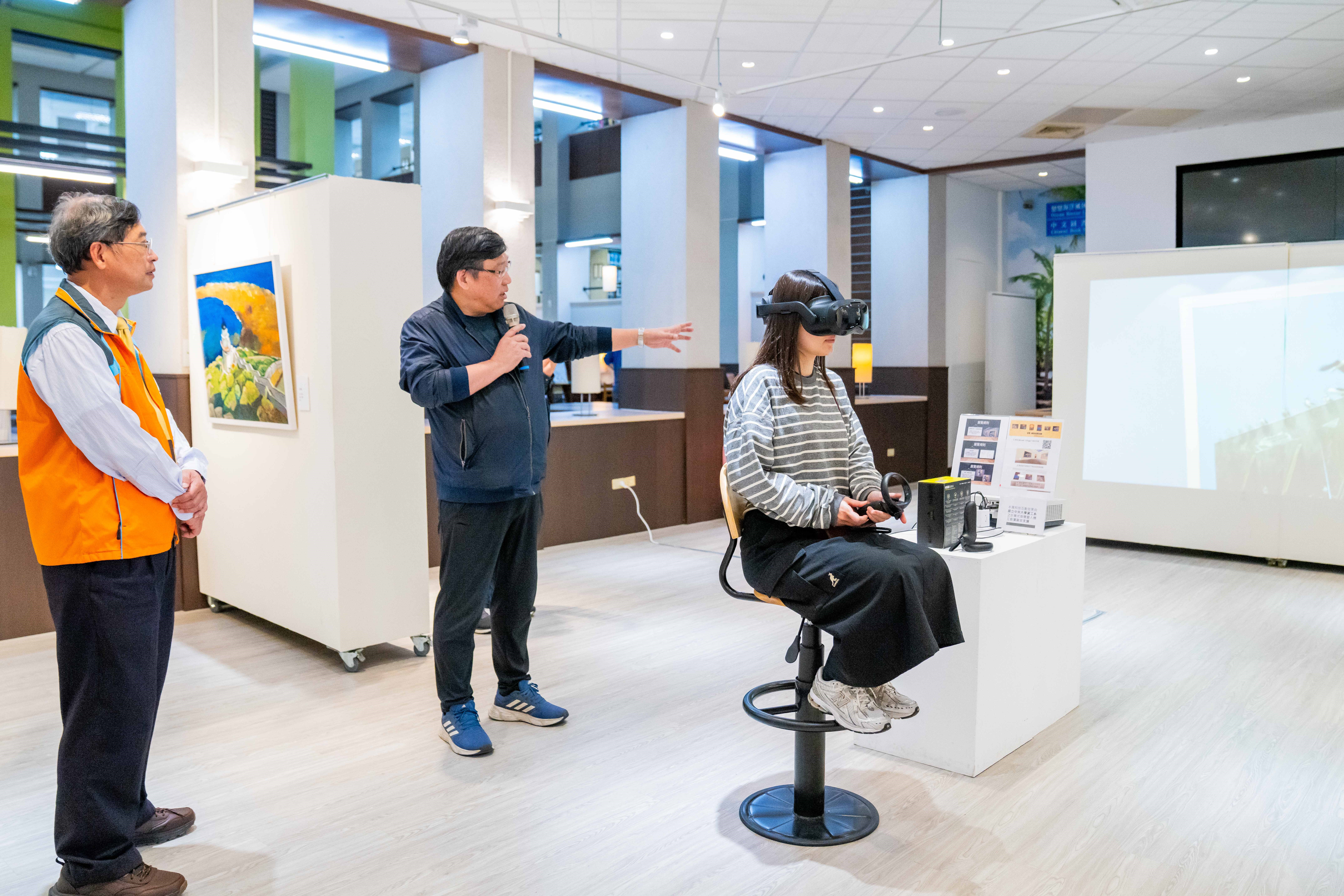 圖二:展區現場搭配VR搭配與互動實驗室合作的跨域創作,讓觀者能以身體與感官參與創作,透過科技裝置捕捉姿態,延伸成一場「被看見」與「遇見光」的雙向對話。