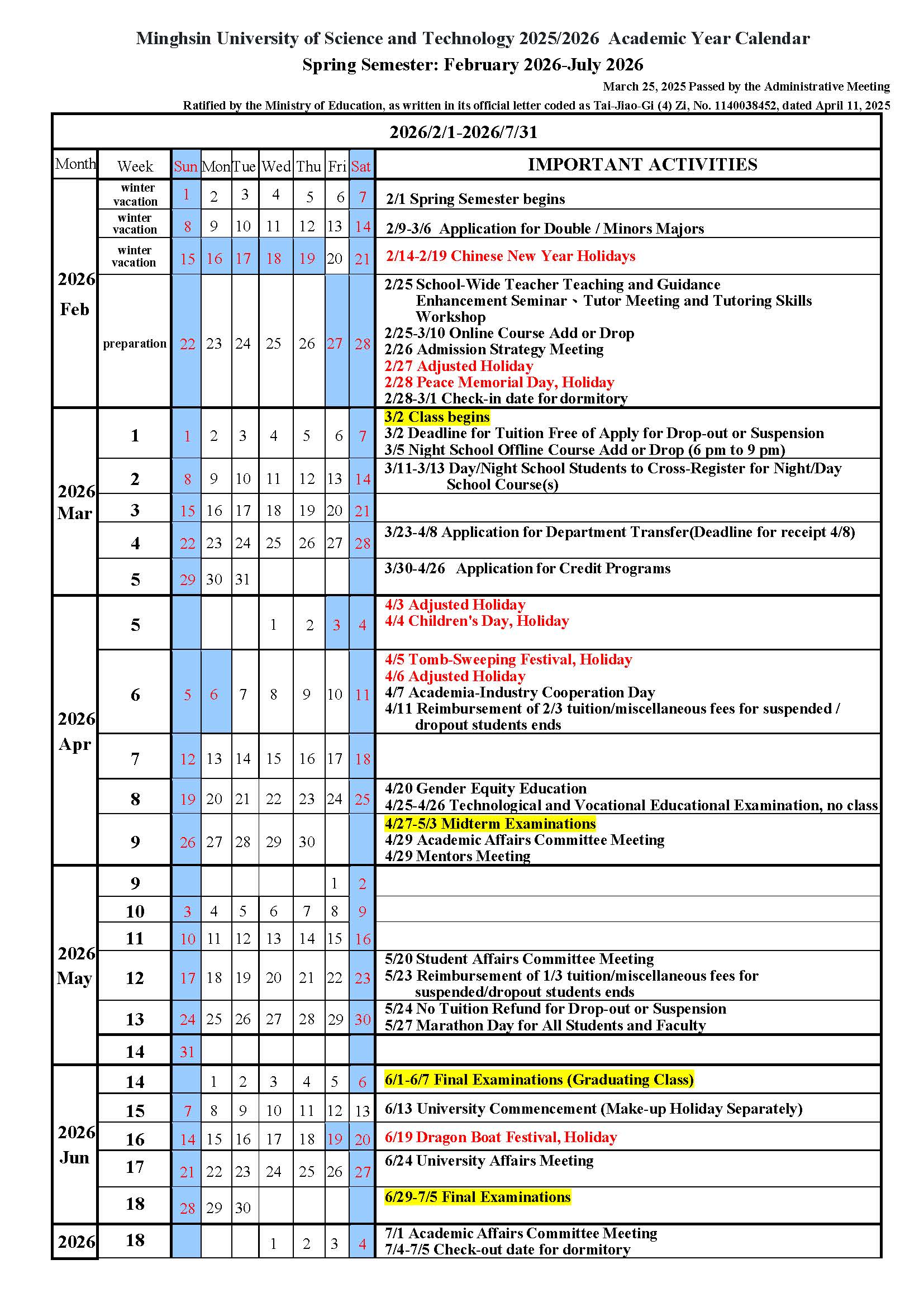Minghsin University of Science and Technology Academic Calendar for the Spring Semester of Year 2026 (明新科大114-2學期行事曆公告)