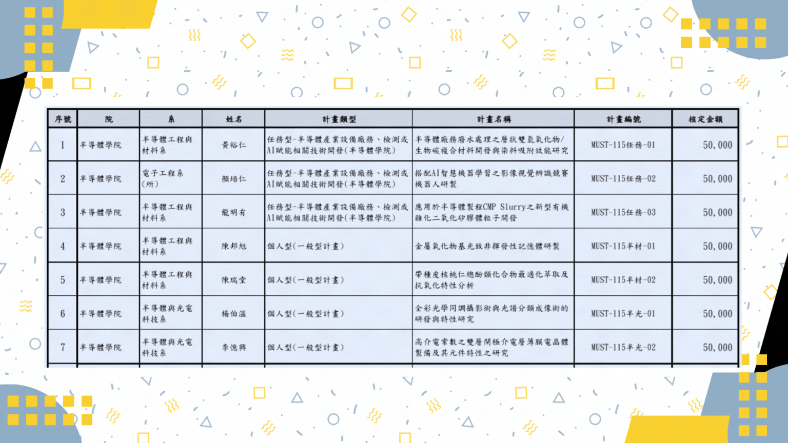 【獲獎】 半導體學院115年校內專題研究計畫核定