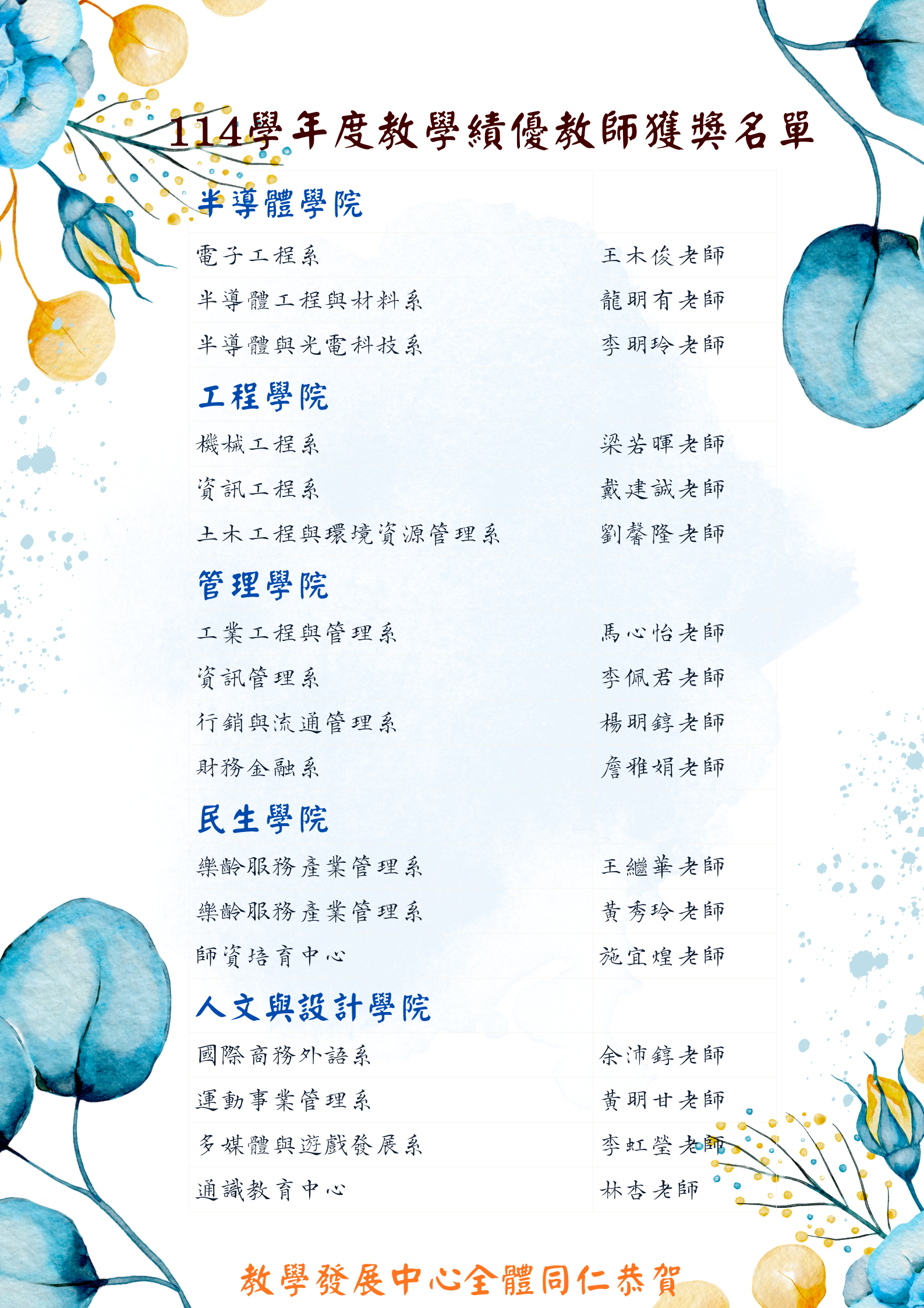 【榮譽】半導體學院114學年度教學績優獲獎教師