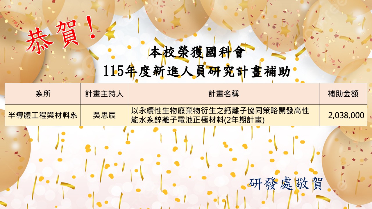 【榮譽】恭賀!!半材系吳思辰老師榮獲國科會115年度新進人員研究計畫補助