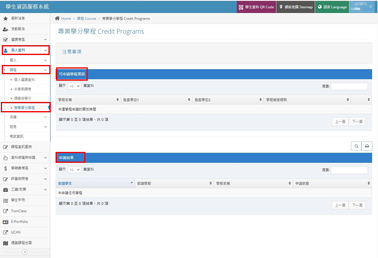 (五)修讀申請路徑:登入「學生資訊服務系統」→個人資料→課程→專業學分學程→