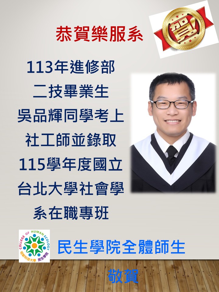 【恭賀】樂服系113年進修部二技畢業生吳品輝同學考上社工師並錄取115學年度國立台北大學社會學系在職專班