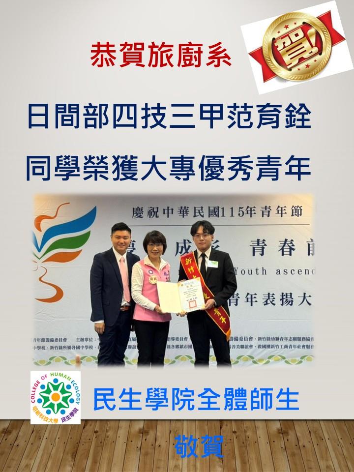 【恭賀】旅廚系三甲范育銓同學榮獲大專優秀青年