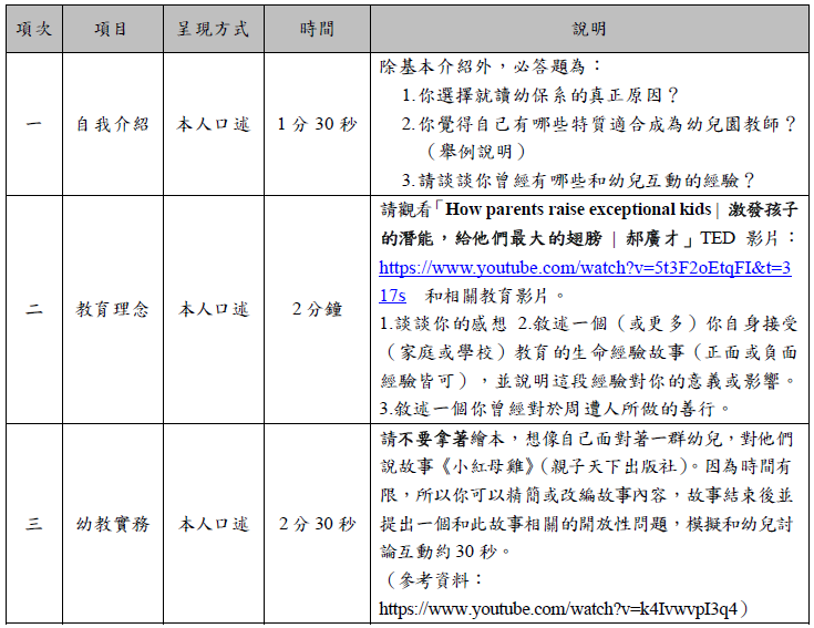 (2)面試影片總長度最長以7分鐘為限,拍攝時不可中斷亦不可剪接,並依序包含前述3個面試項目。