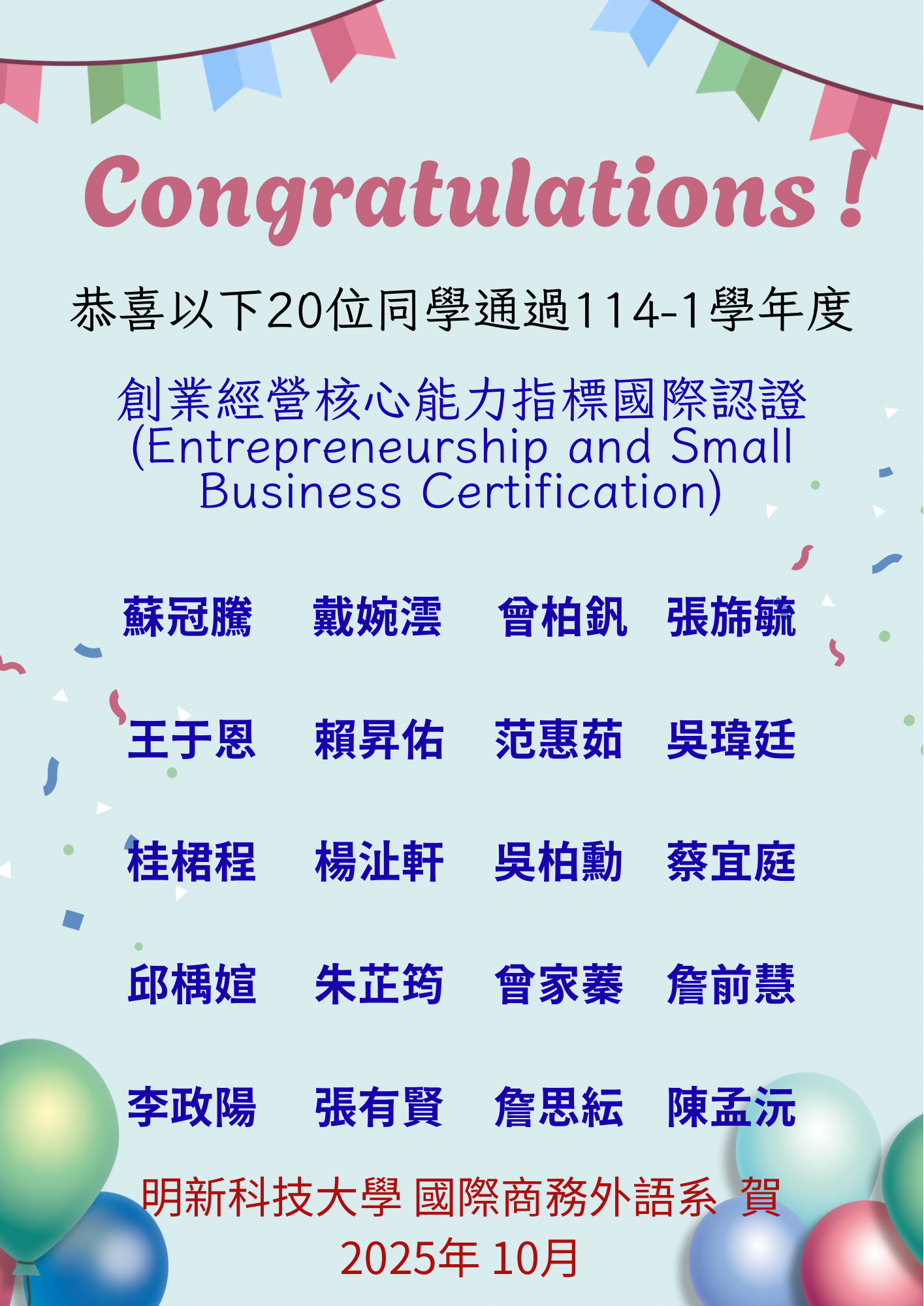 {狂賀}本校學生取得創業經營核心能力指標國際認證