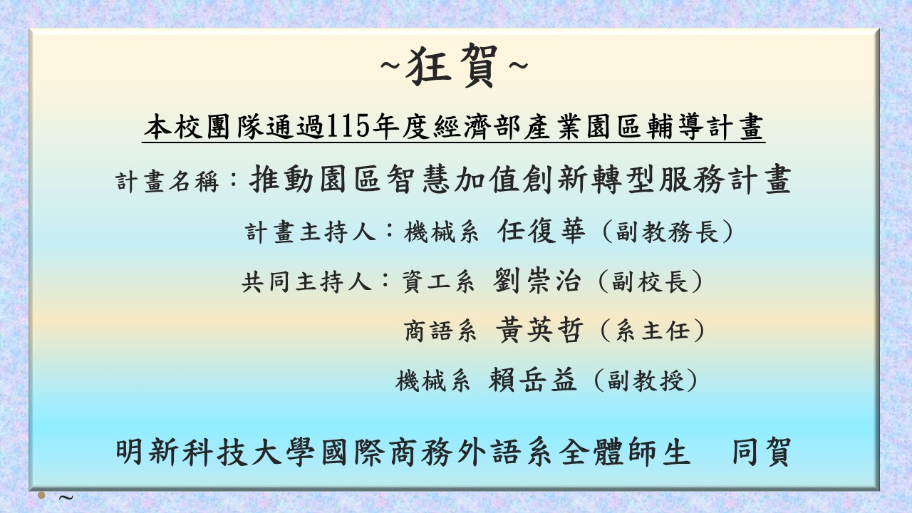 {狂賀}本校團隊通過115年度經濟部產業園區輔導計畫