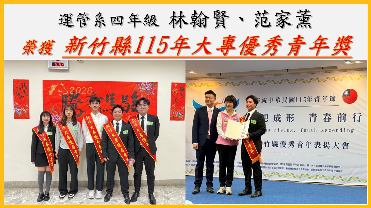 【獲獎】運管系林翰賢、范家薰榮獲 新竹縣115年大專優秀青年