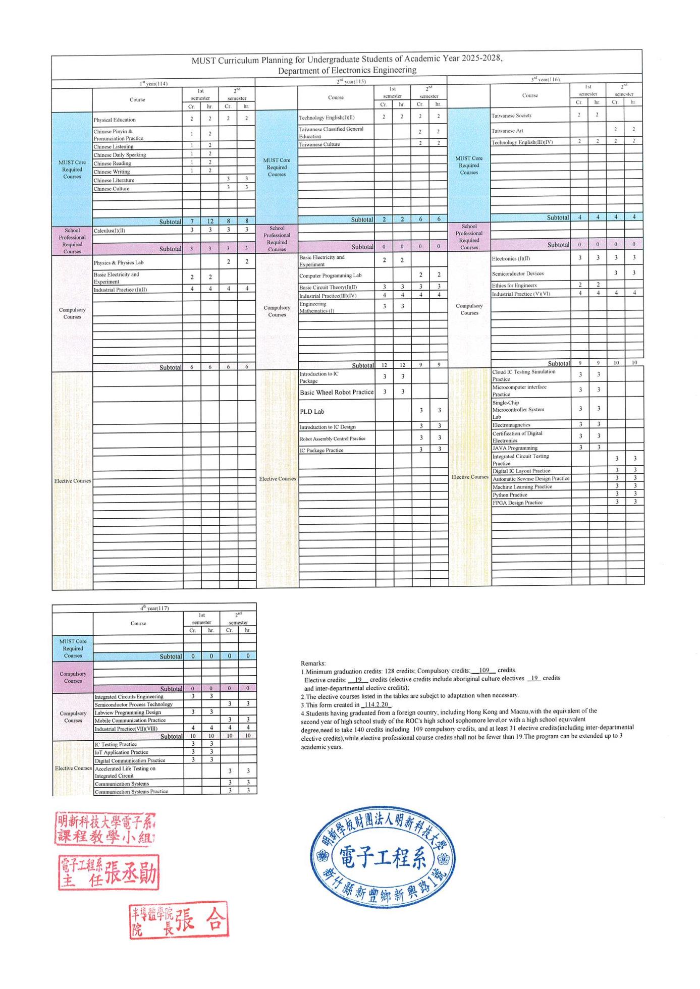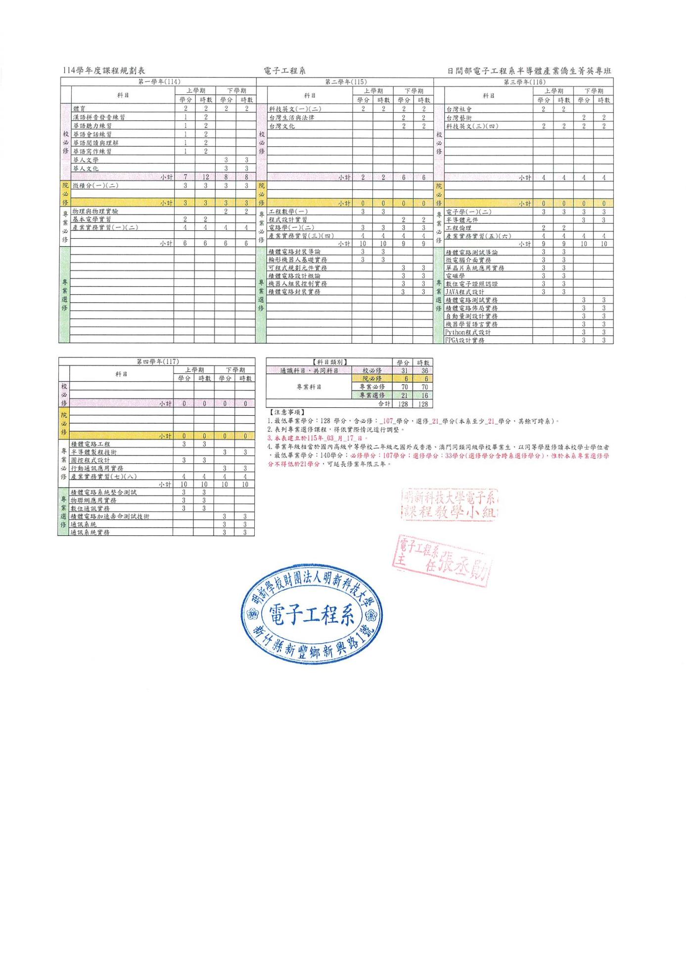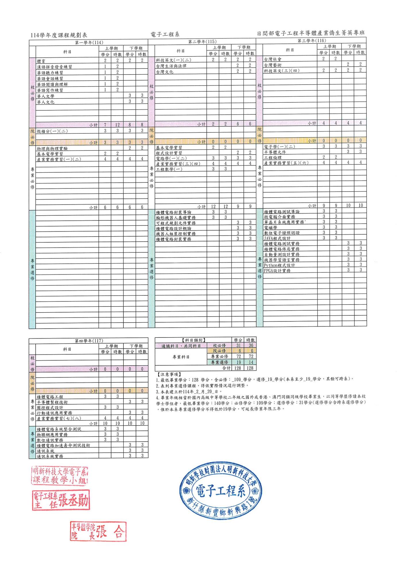 114日間部電子工程半導體產業僑生菁英專班課程規劃表