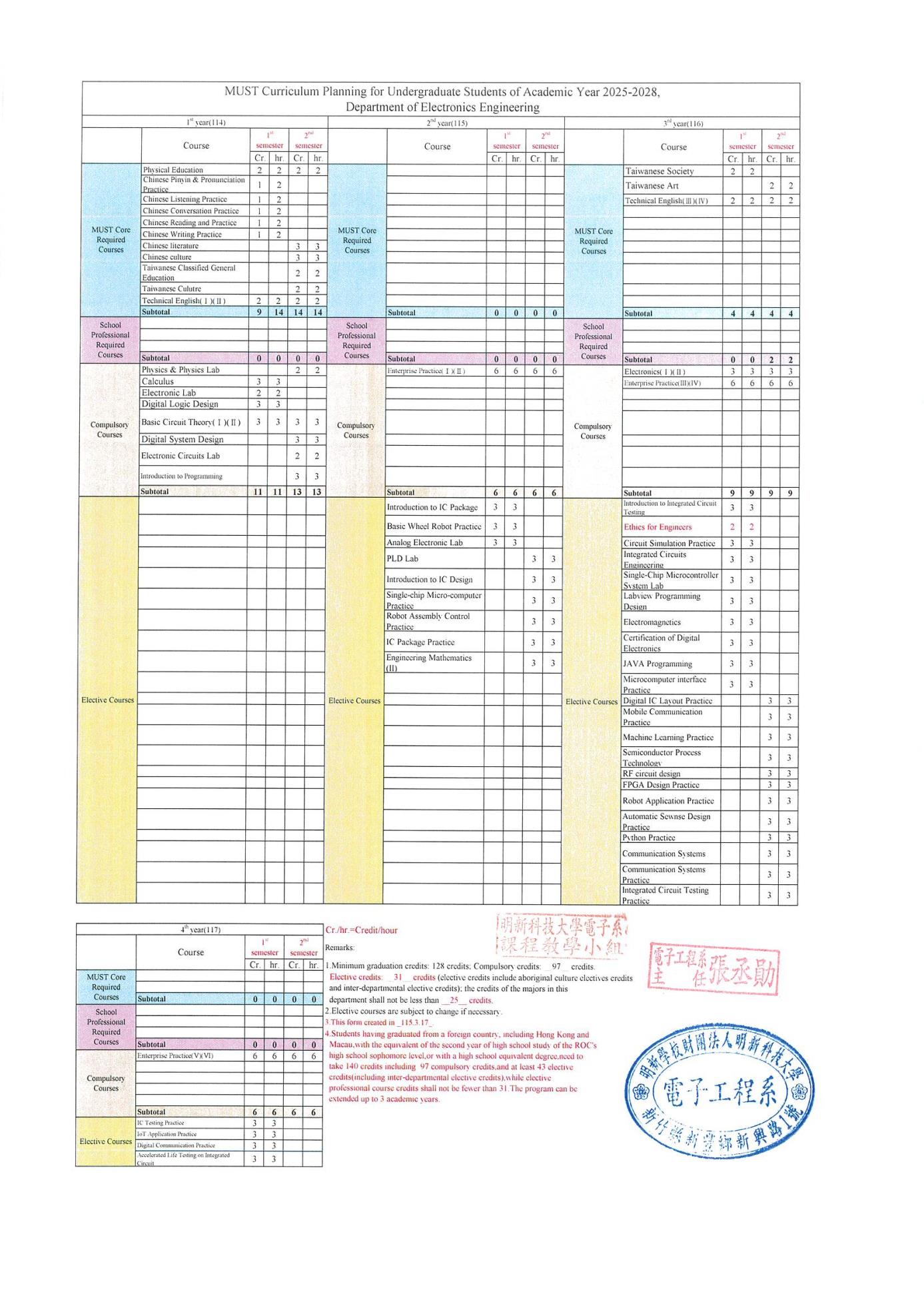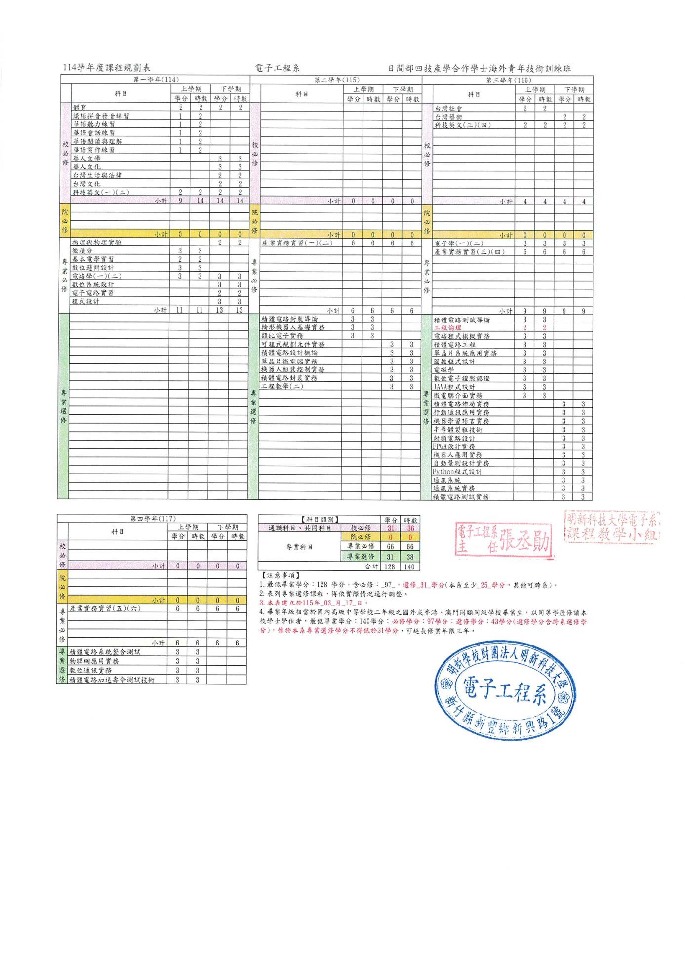 114日間部電子工程半導體產業僑生菁英專班課程規劃表