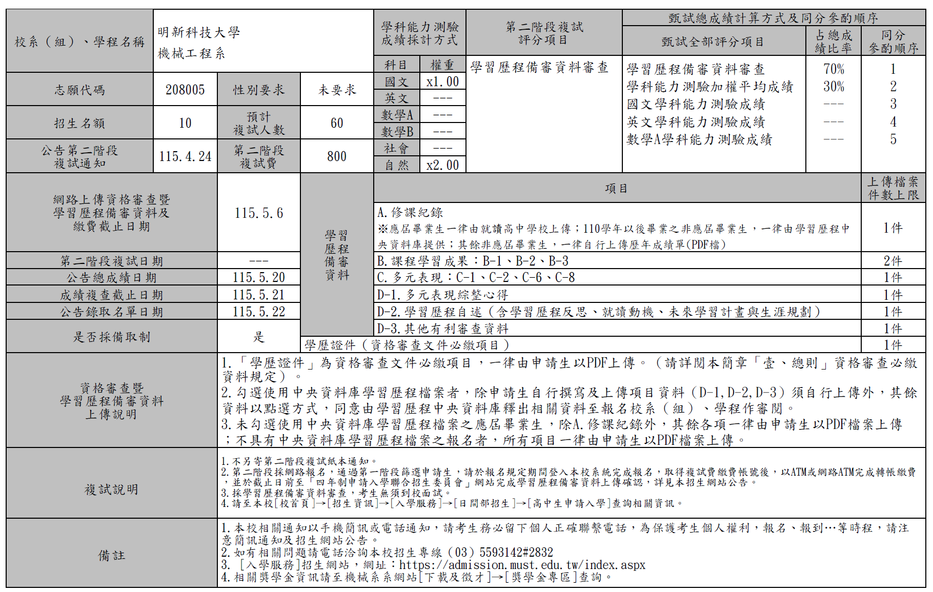 115學年度機械系招生名額
