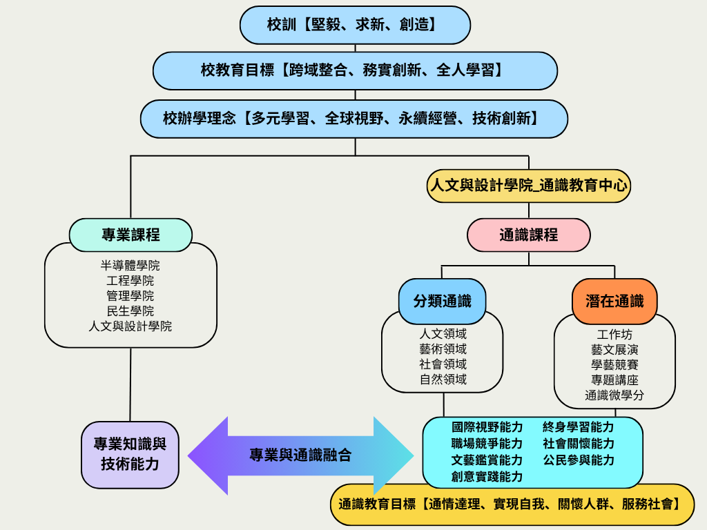 依據校教育目標及通識教育目標,為培育學生兼具國際視野能力、職場競爭能力、文藝鑑賞能力、創意實踐能力、公民參與能力、社會關懷能力及終身學習能力之素養,各學制學生須修滿通識教育課程請參酌通識課程架構圖。